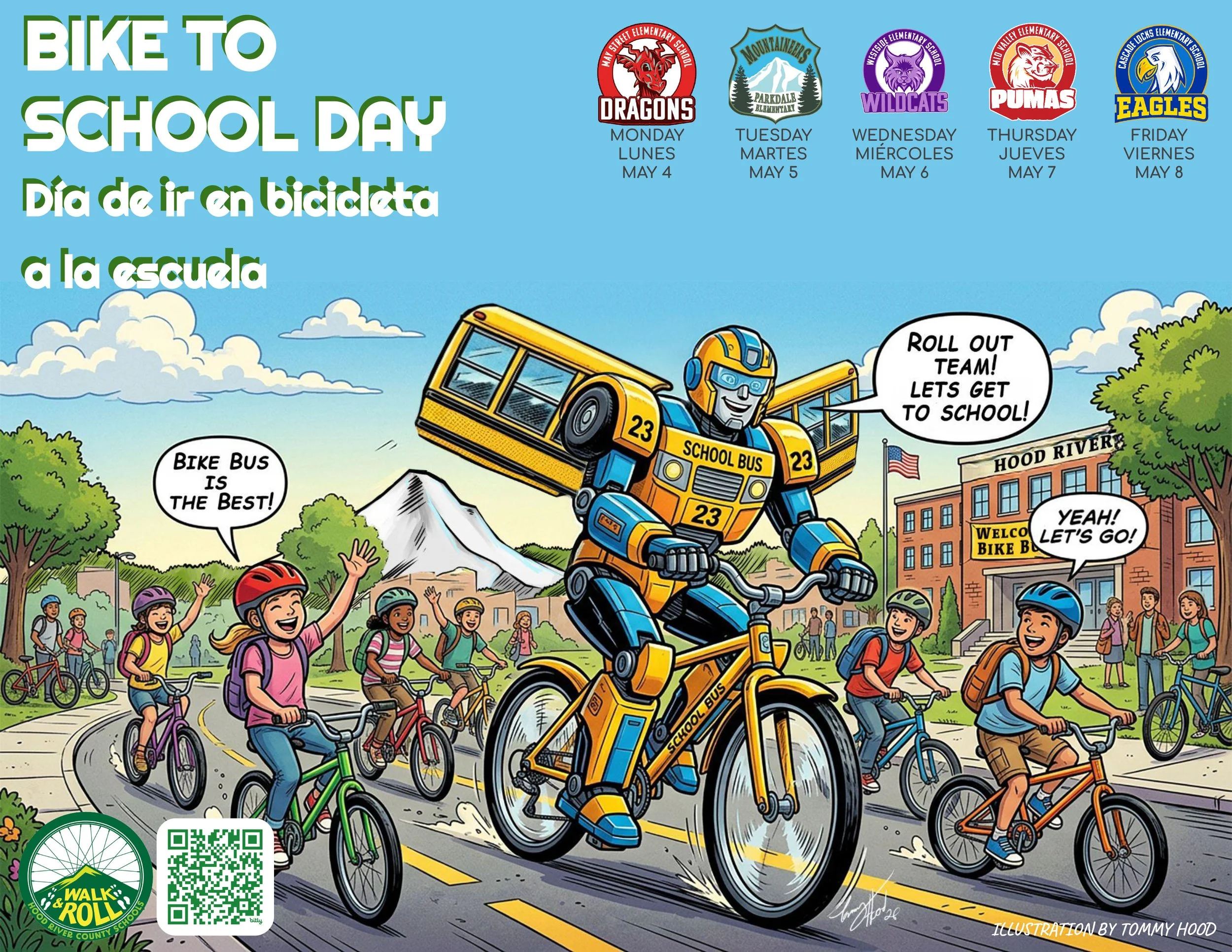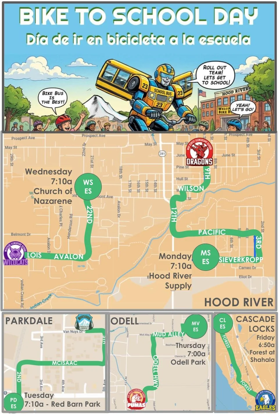 Join Hood River County’s five elementary schools as we celebrate a full week of biking, walking, and rolling to school! Each morning, students and families can meet at designated locations to ride together in a Bike Bus—building confidence, community, and joy on the way to school.