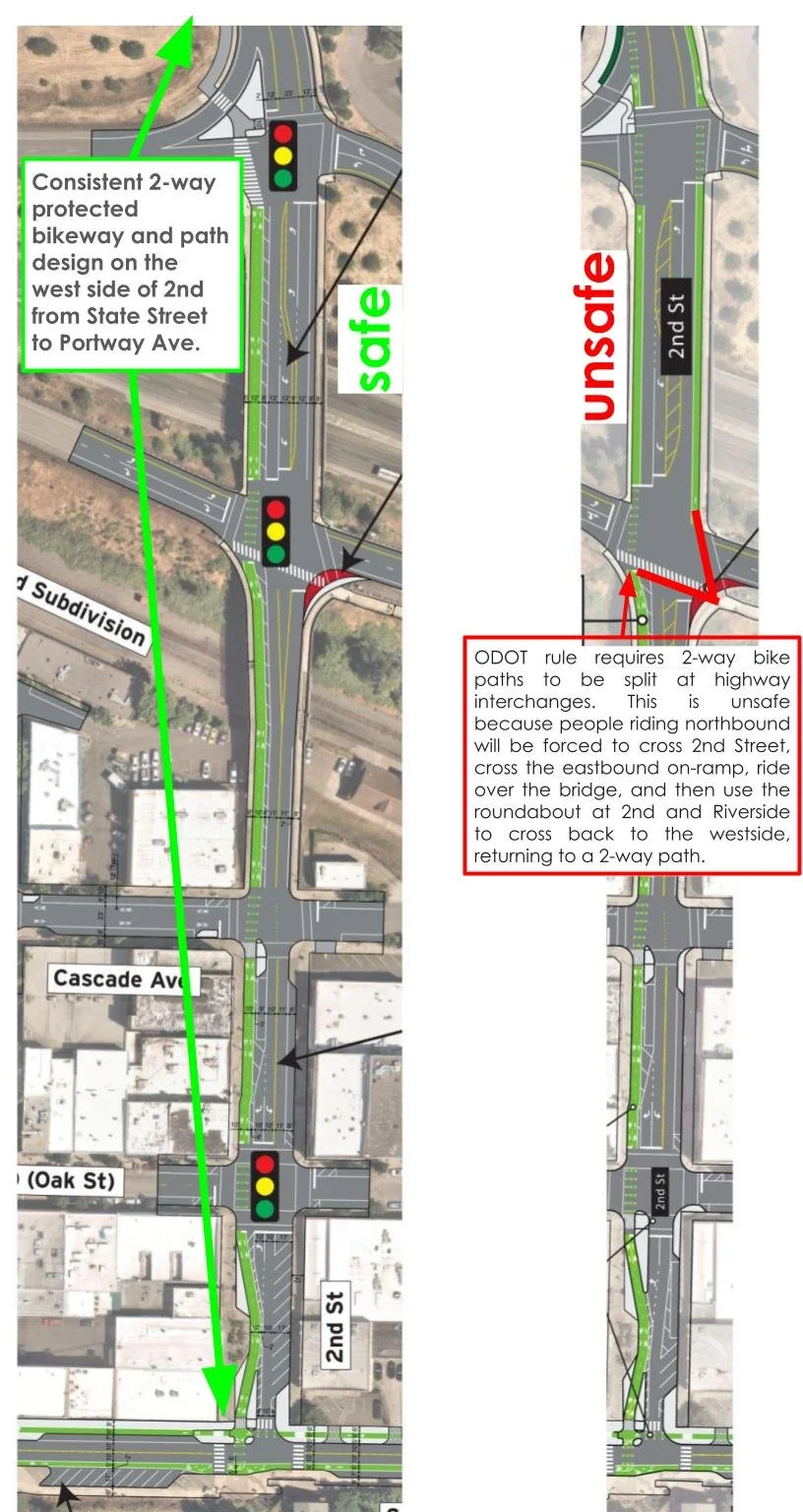 Oregon Department of Transportation does not allow 2-way bikeways through interchange areas. Without an exemption, the design forces people biking to cross 2nd Street and the eastbound entrance ramp at one of the city’s most dangerous locations for pedestrians and cyclists.