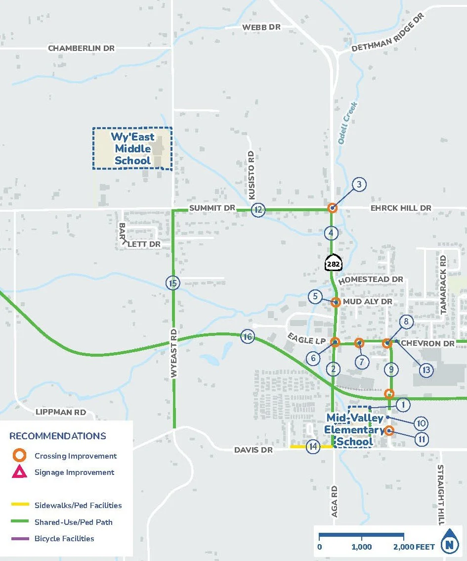 Together with Mid Valley Elementary School, Odell has a total of 16 infrastructure recommendations including sidewalks on AGA Road and Odell Highway. Beginning on page 30 of the plan, you will find a school site plan, identified barriers for students and recommendations to make walking and biking safer -